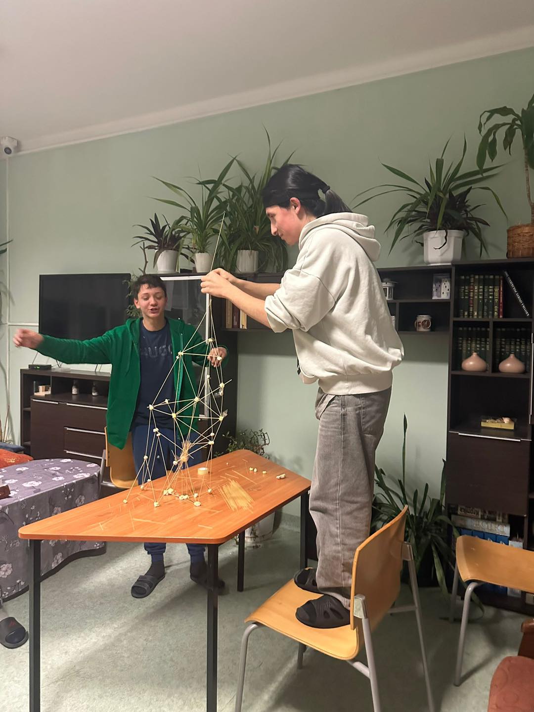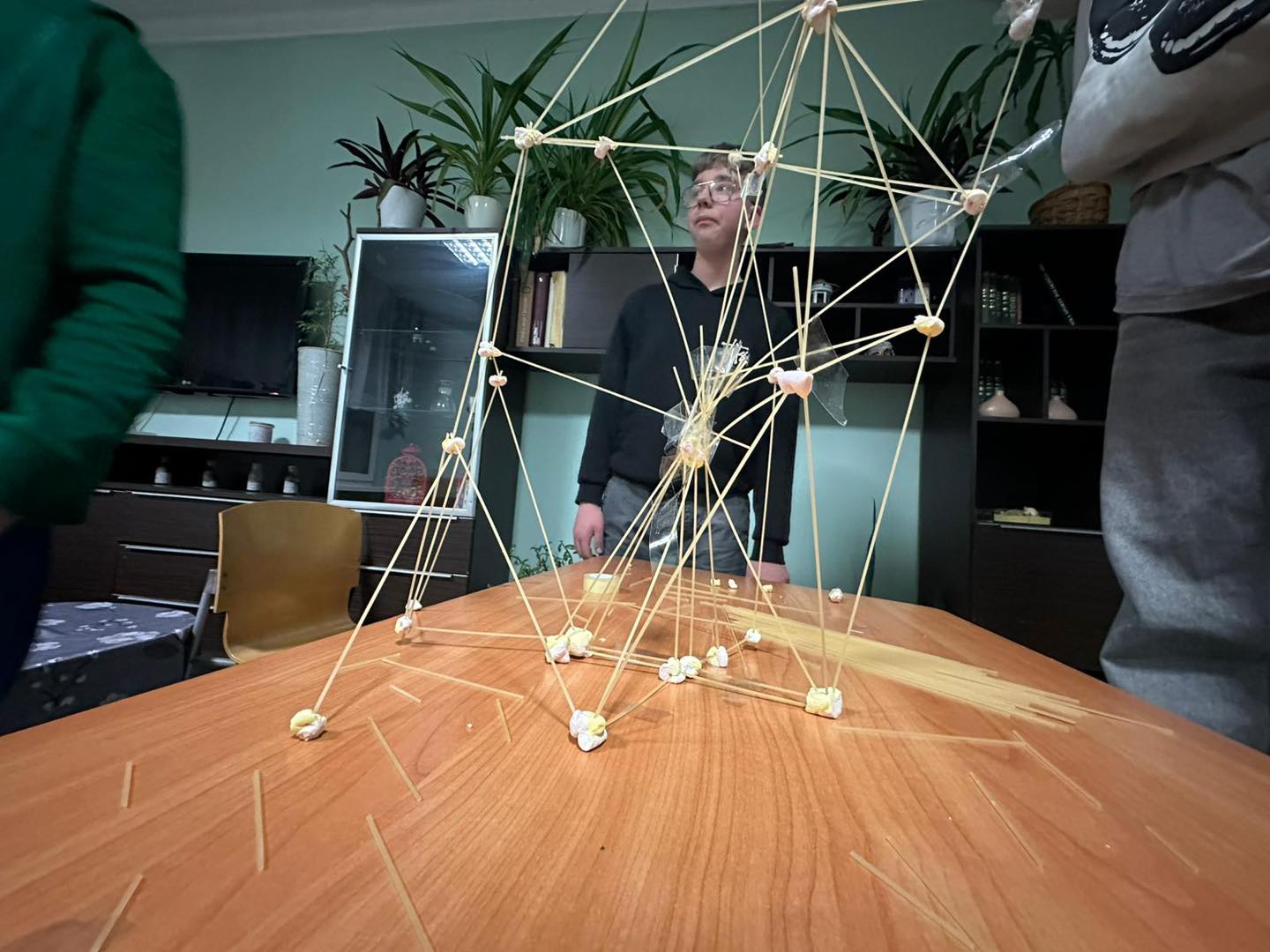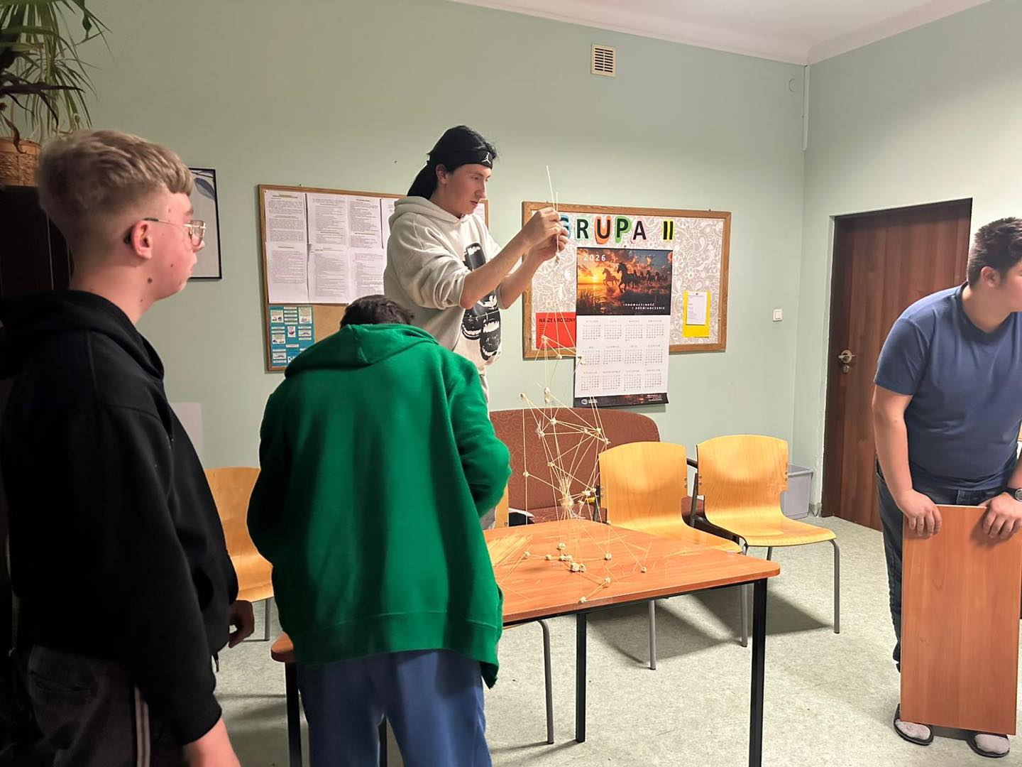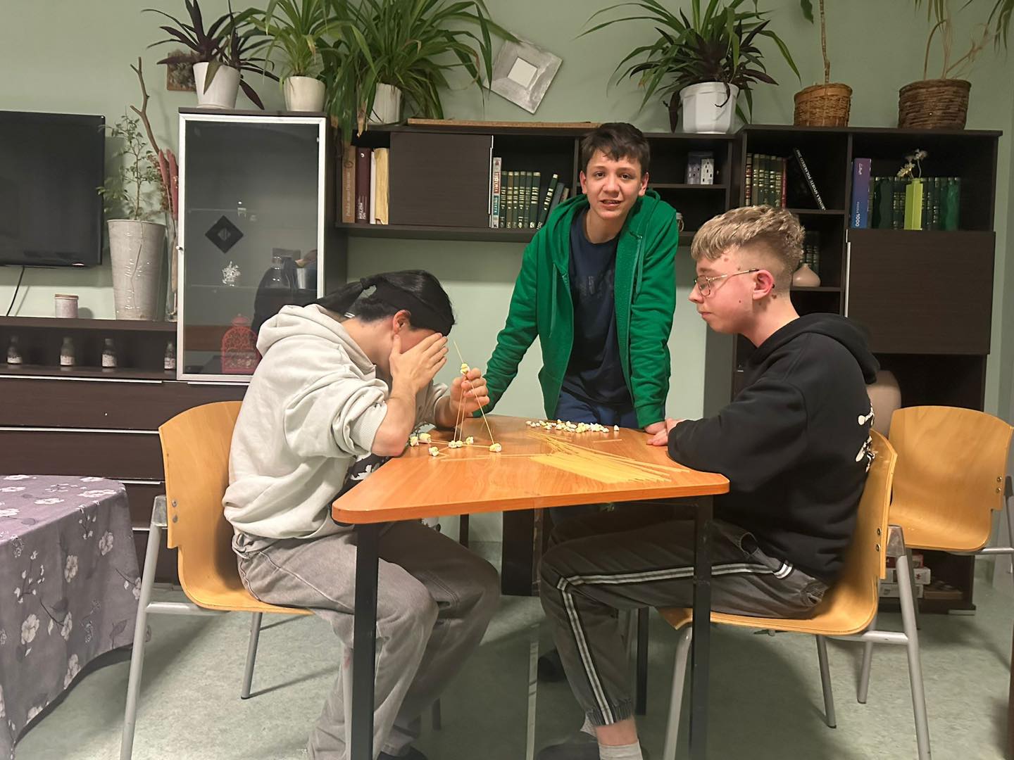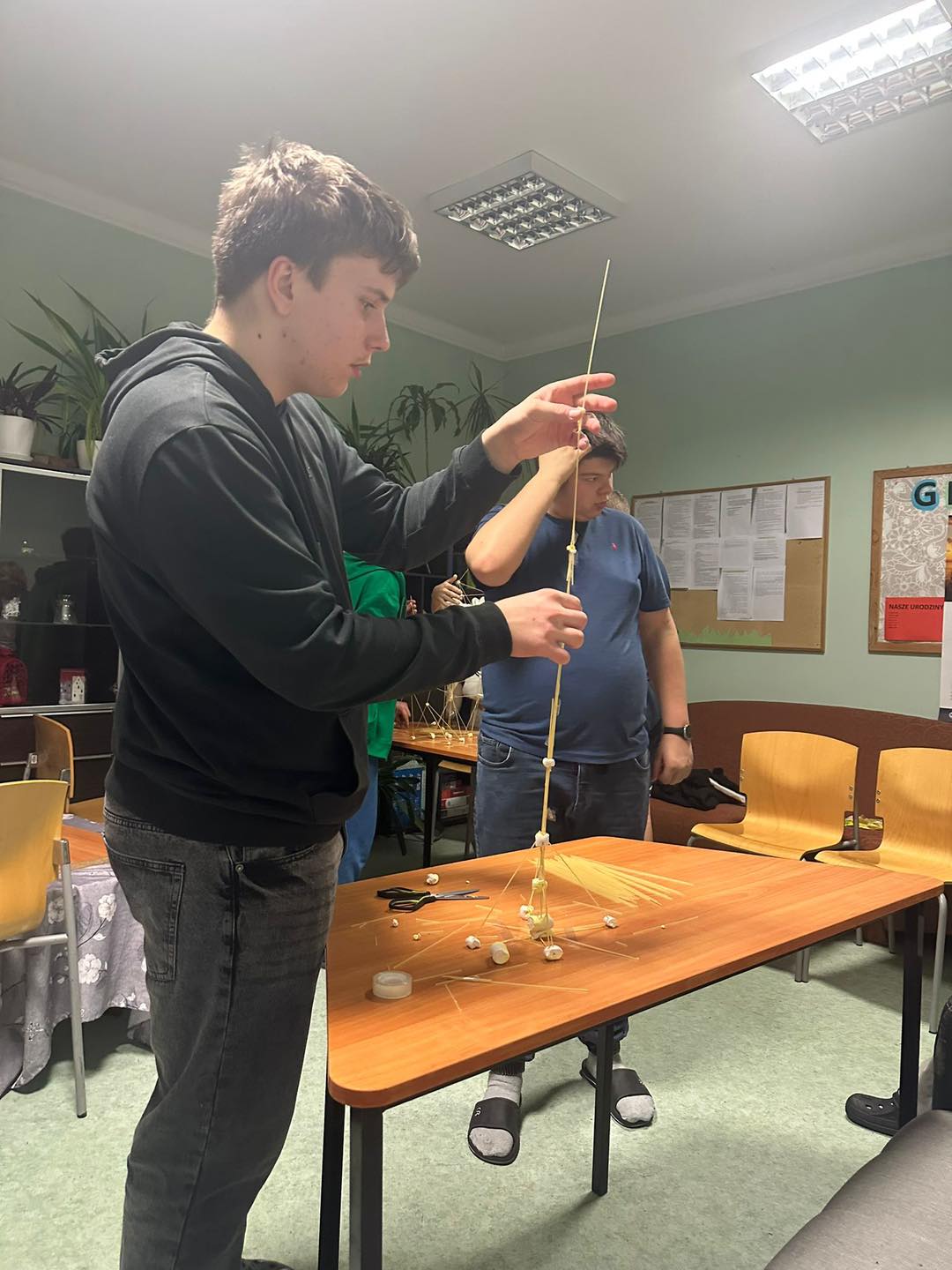 Chłopcy rywalizowali w dwóch zespołach, a ich zadaniem było zbudowanie jak najwyższej wieży z wykorzystaniem tylko trzech materiałów: pianek marshmallow, makaronu spaghetti oraz taśmy klejącej.